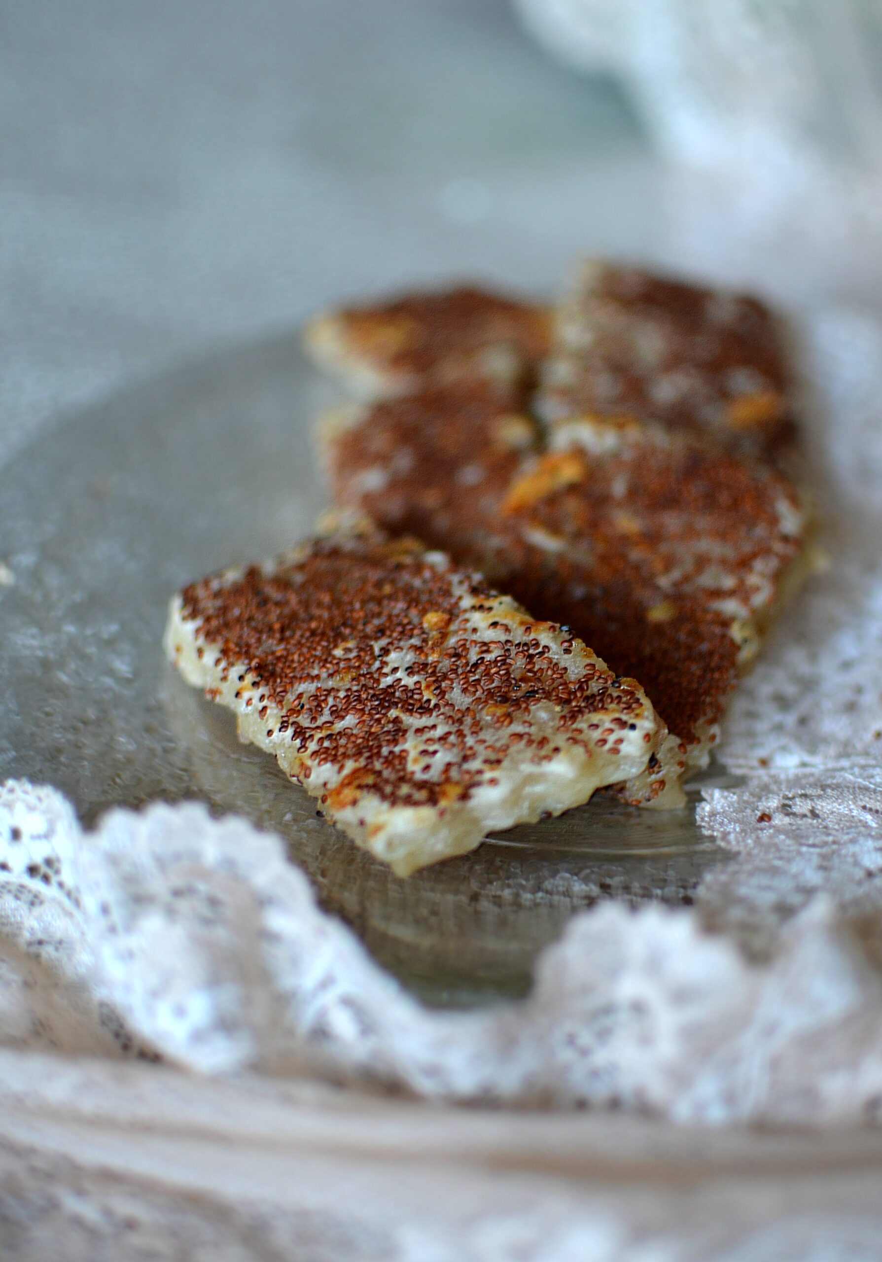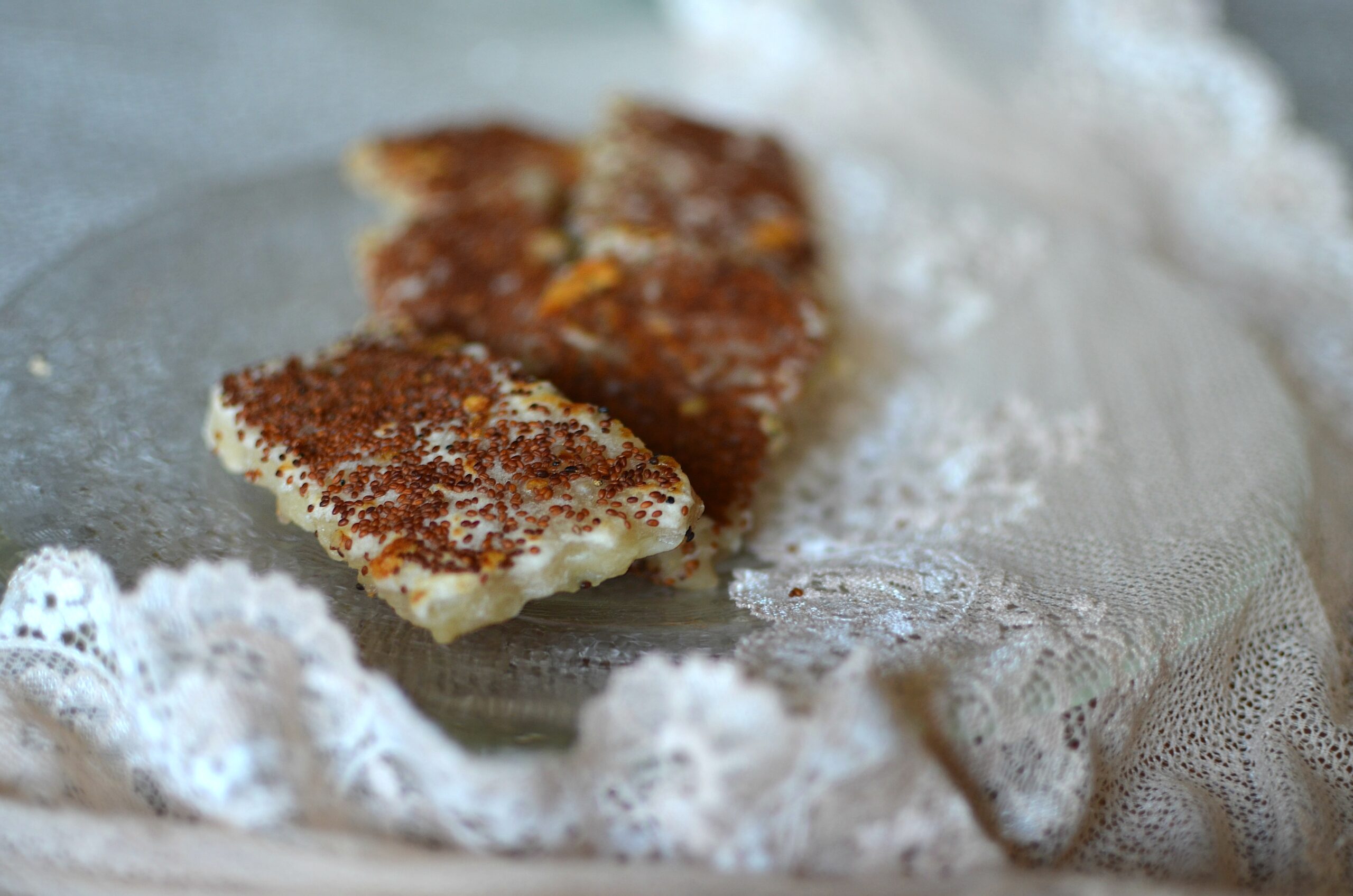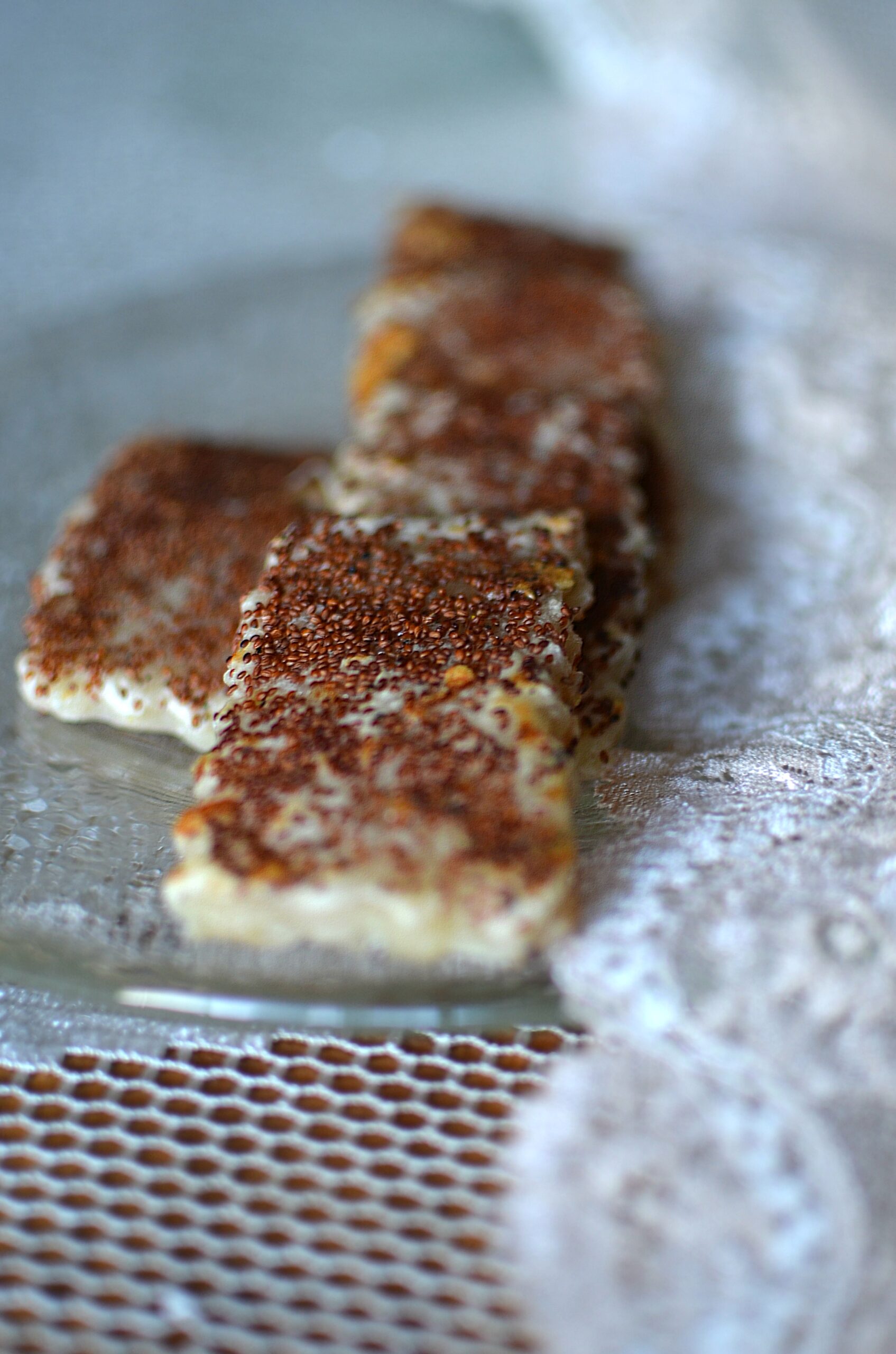 Tešlą plonai iškočioju, vienodu sluoksniu užberiu sūrius ir česnaką, tuomet tešlą susuku į ruloną ir vėl iškočioju, ne itin plonai (5-6 mm), užberiu sėklomis ir jas kočėlu lengvai įspaudžiu į tešlą, kad nebyrėtų kilnojant. Pjaustymo ratuku išpjaunu pailgus stačiakampius, įkaitinu keptuvę ir dedu pyragėlius. Kepu po 2-3 minutes iš abiejų pusių. Jokių riebalų nereikia, užtenka tiek, kiek yra tešloje.