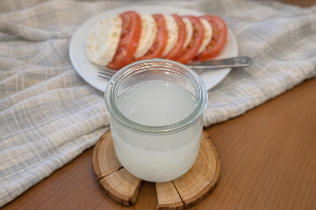 Kai tik virtuvėje atsiranda mocarelos pakuotė, aš pirmiausia pagalvoju ne apie sūrį, o tą baltą skystį, kuris dažnai lieka nepanaudotas. O jis toks švelnus, toks pieninis, su vos juntamu sūrumu, kad būtų nuodėmė jį išpilti.